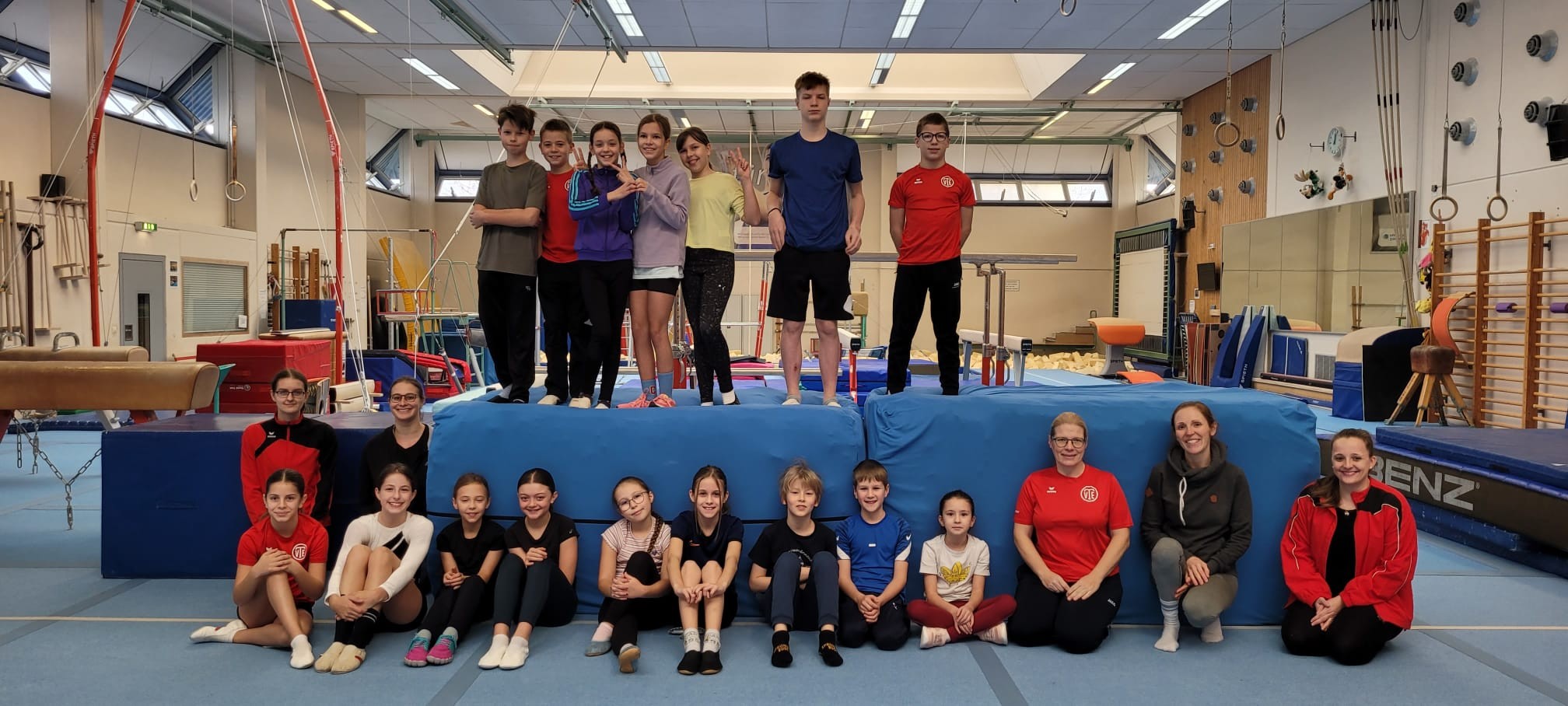 Am Sonntag, den 23.11.2025 mietete die Turnabteilung für die 3. und 4. Klässler der Gruppe „Grundschulturnen“ und für die Gruppe „Jugendturnen“ eine der zwei Hallen des Turnzentrums Heidelberg. Schon wochenlange freuten sich die Kinder und Jugendlichen auf den besonderen Trainingstag. Als sie die große Halle mit all den aufgebauten Geräten der Leistungsturner betraten staunten sie nicht schlecht und wussten erst einmal nicht, an welchem Gerät sie zuerst turnen sollten. Sie hatten unter anderem die Möglichkeit den Spannbarren, den gefederten Boden und den Schwebebalken ausgiebig auszutesten. Der gefederte Boden ermöglichte plötzlich viel höhere Sprünge und sichere Landungen. Der Spannbarren war für alle neu und bot viel mehr Raum für die Übungen als das Reck in der eigenen Halle.